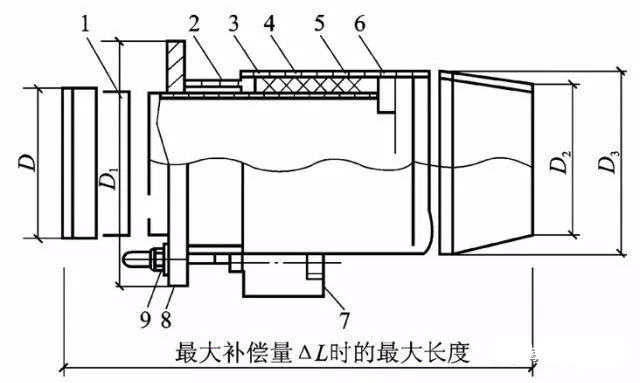 套筒补偿器是由填料密封的套管和外壳管组成的,两者同心套装并可轴向补偿,有单向和双向两种形式,图五是单向套筒补偿器。套筒与外壳体之间用填料圈密封,填料被紧压在端环和压盖之间,以保证封口紧密。填料采用石棉夹铜丝盘根,更换填料时需要松开压盖,维修方便。套筒补偿器的补偿能力大,一般可达250400mm,占地小、介质流动阻力小、造价低,适用于工作压力小于或等于 1.6 MPa、工作温度低于300℃的管路上,补偿器与91视频专区免费看道采用焊接连接。